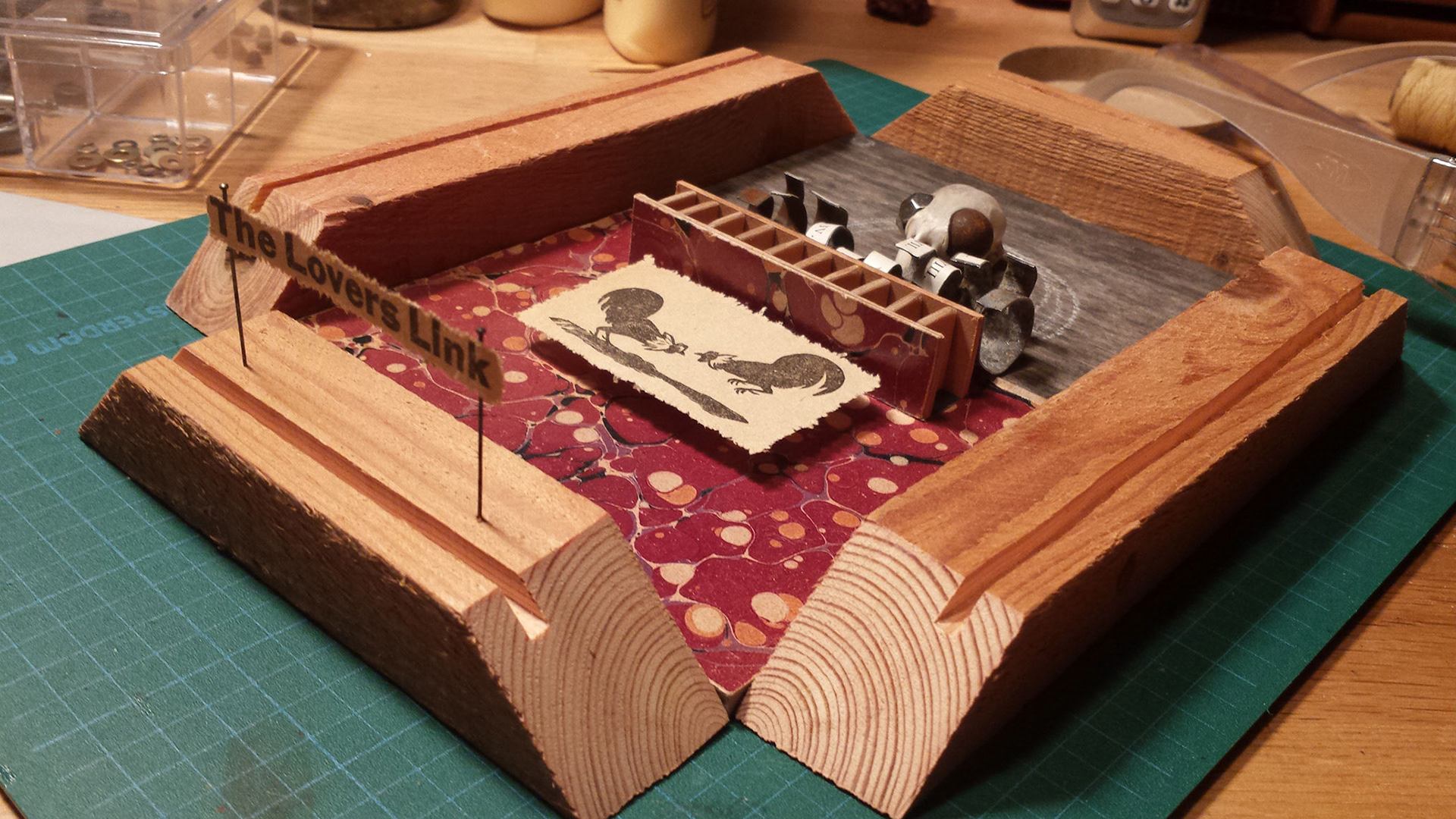 Commissioned 10 year wedding anniversary gift. Ingredients: aged pine, tin, glass, bird skull, bead, ball bearing, image, text, insect mounting pins, hair, dust, sea snail shells, beetles. This commissioned piece for a married couple's 10 year anniversary explores the duality and longevity of their union after a decade. I chose to use objects the husband gave me, perhaps of some sentimental value, definitely old, and incorporate the material tin, as a symbol of the 10 year, as tradition has it. The piece is divided in two, with an upstairs and a downstairs, to symbolize the structure of a marriage, and the ups and downs of that relation. Divided by a cross-section of 10 floorboards, filled with the dust and leftover creatures of the past, the things we sweep away. The eyes of the bird show the duality of the union: smooth and rough, earthy and intangible, weathered and sharp. The fighting roosters represent how we at times show our talons, as opposed to our wisdom and love, and the skull represents that life shared as the completed circle.